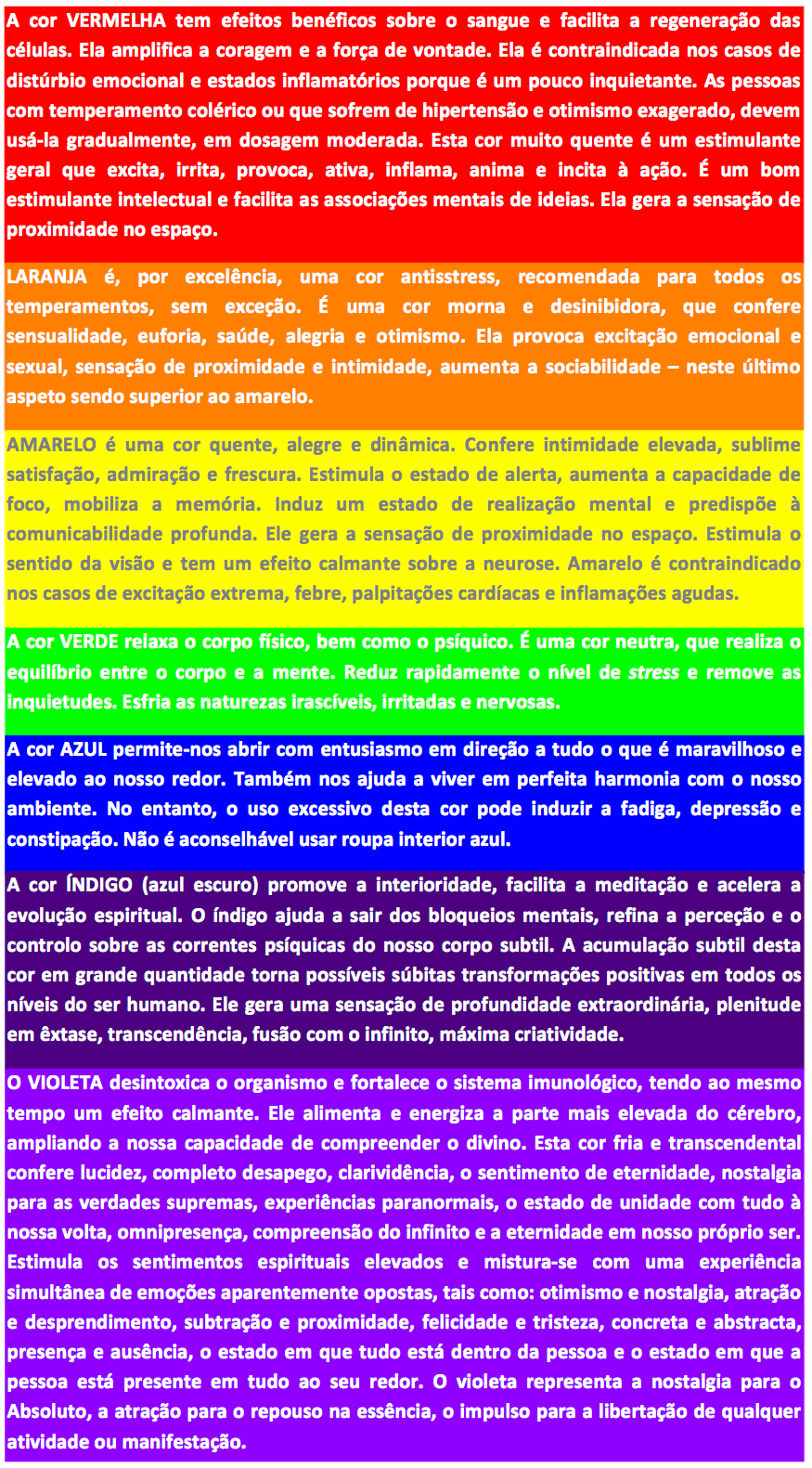 O ser humano precisa de todo o espectro de tons de cor oferecido pela natureza para atingir o estado de equilíbrio psíquico. As cores podem ser usadas para equilibrar o nosso ser e a nossa vida, para preservar um estado edificante de felicidade, para despertar as nossas potencialidades, bem como para acelerar a nossa evolução espiritual. As suas qualidades e influências podem ser induzidas através das roupas, pedras preciosas, vidro colorido, iluminação, arranjos de flores de interior e exterior, etc.